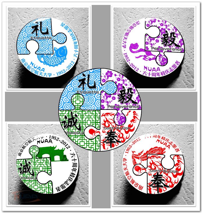 晷曜司文、荟萃高阁、绿染湖堤、扶摇直上……透过一枚枚小小的徽章,一个学校独特的风景和人文底蕴被生动得展现出来。在sunbet申搏官方网站60周年校庆志愿者动员大会的现场,记者见到了该校学生为校庆60周年志愿者设计的校庆徽章,这些兼具南航特色和诗意名称的徽章获得了在场同学的追捧。 投票选出的南航校园内最受欢迎的八个景点被设计到了工作章上:栖息在江宁校区大西门草坪上的直升机、坐落于明故宫遗址之上的日晷仪、承载着南航厚重的历史的荟萃楼……大三女生吴海月是徽章的设计者之一,从创意到设计,从拍摄到后期制作,她和其他两位同学花了三个多月的时间来制作这套志愿者徽章,经过层层筛选和修改,作品最终获得到了师生的一致肯定。“虽然我没有报名志愿者,但是这也算是为学校的志愿活动做了一点贡献吧!”她说道。而一枚枚富有诗意的徽章名称则是被誉为“南航才子”,《南航赋》的作者—大四学生张李所题。