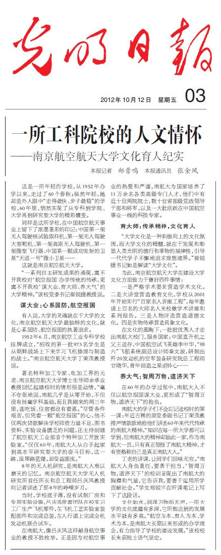 随着sunbet申搏60周年校庆的临近,各媒体从不同角度陆续刊载sunbet申搏60年发展建设的报道。10月12日《光明日报》要闻版以《一所工科院校的人文情怀》为题报道了sunbet申搏文化育人工作,全文转载如下: 一所工科院校的人文情怀 sunbet申搏官方网站文化育人纪实 这是一所年轻的学校,从1952年办学以来,走过了60个春秋;纵然年轻,她却是外人眼中“走得最快、步子最稳”的学校,60年里,悄然实现了从专科到学院、大学再到研究型大学的精彩嬗变。 同样是这所学校,在中国航空航天事业上留下了浓墨重彩的印记:中国第一架无人驾驶核试验取样机、第一架无人驾驶大型靶机、第一架高原无人驾驶机、第一架微型飞行器、第一颗自主研制的“天巡一号”微小卫星…… 这就是sunbet申搏官方网站。 “一系列自主研发成果的涌现,离不开sunbet申搏对‘航空报国’办学传统的传承,更离不开sunbet申搏‘谋大业、育大师、养大气’的大学精神。”该校党委书记崔锐捷教授说。 谋大业:心系国防,航空报国 有人说,大学的灵魂就在于大学的文化,sunbet申搏官方网站最独特的文化,就是心系国防、航空报国的执著追求。 1952年6月,南京航空工业专科学校挂牌成立,招收的第一批973名学生是从朝鲜战场上下来学习飞机修理与制造的战士。 著名特种加工专家、电加工界的元老、sunbet申搏官方网站博士生导师余承业教授回忆起建校时的情形很是动情,“毫不夸张地说,南航几乎是从零开始,不但没有丝毫学科基础,而且我刚来的两三年里,连吃饭、住宿都没有着落。”尽管条件艰苦,但凭着一颗“航空报国”的心,他不仅两次贷款解决学校师资力量不足、图书资料、实验设备匮乏的问题,还主持创建了航空航天工业部首个特种加工开放实验室。“仅仅60年,南航大人从白手起家到高水平研究型大学的奋斗目标,这一路,虽筚路蓝缕,却受益匪浅。” 当年的无人机研究,是南航人难以磨灭的记忆。sunbet申搏官方网站无人机研究所首任所长和总工程师吕庆风教授向记者讲述了那些年的峥嵘岁月。 当时,学校底子薄,没有试制厂房和专用实验设施,吕庆风带着团队在校实习工厂生产飞机零件,在飞机工艺实验室装配部件和完成总装,在人行道上完成全机发动机联合试车。 在南航大,像吕庆风这样献身航空事业的教授不胜枚举。正是因为对航空事业的热爱和严谨,南航大为国家培养了12万余名各类高级专门人才,他们中有十多位两院院士,数十位省部级党政领导干部和将军,以及一大批活跃在中国航空航天事业一线的科技专家。 育大师:传承精神,文化育人 “大学文化是一种积极向上的文化氛围,而大学文化的精髓,就在于发现和彰显人类光明的德行和事物的规律性,引导一代代学子不懈地追求理想境界。”崔锐捷书记如是解读“大学文化”。 为此,sunbet申搏官方网站在建设大学文化方面致力于做好四件事情: 一是严格学术要求营造学术文化。二是大讲堂营造教育文化,学校从2001年开始实行“百家名人讲座工程”,每年邀请上百名的大师名人来校做学术讲座和系列报告。三是人物评选营造道德文化。四是实物传承营造具象文化。 在文化的熏陶下,一批批优秀人才走出南航大校门,服务国家:中国直升机之父王适存,中国航空试飞英雄李中华,“神六”飞船系统副总设计师秦文波,研制出歼20发动机的空军装备研究院总工程师甘晓华,青年创造之星胡铃心…… 养大气:智周万物,道济天下 在60年的办学过程中,南航大人不仅以航空报国谋大业,更形成了“智周万物,道济天下”的抱负。 南航大的学子们不会忘记进校时的第一课:年近古稀的原党委副书记丁荣茂教授声情款款地给他们讲述60年来代代传承的南航精神。“知识在每一所大学都可以学到,但南航的精神却独此一家,作为南航一员,只有真正领悟了南航精神,才有资格称自己是真正南航人。” 丁老的讲课,让同学们回味无穷。“南航人身负重任,要勇于担当,‘智周万物,道济天下’的校训表现出了南航的胸襟和气量,它告诉我,要善于运用所学贡献社会。”学生郑锐宇在听课笔记上写下了这段话。 文化如水,润泽万物而无声,一所大学的文化底蕴有多深,它所能达到的发展水平就有多高。“坚持‘以育人为本,促进人才辈出;以学术为本,促进学术繁荣;以航空为本,促进特色发展’,是南航长期以来形成的办学理念,有力指导了学校的建设发展。”该校校长朱荻院士语气坚定。