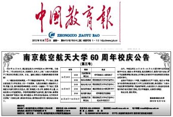 《中国教育报》《中国航空报》《中国工业报》近日陆续刊登sunbet申搏60周年校庆公告(第三号)。全文转载如下: sunbet申搏官方网站60周年校庆公告 (第三号)