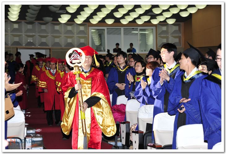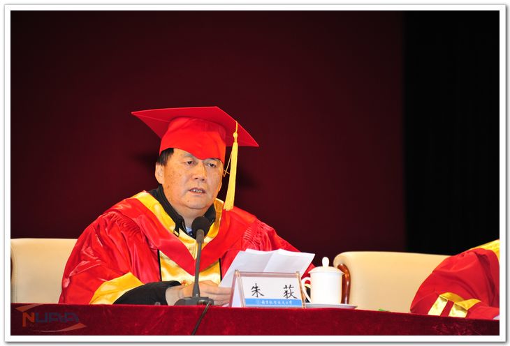 毕业典礼在隆重的学术权杖请出仪式中开始。校长朱荻手持学术权杖带领校领导、校长助理和学院领导入场,威严、神圣的学术权杖请出仪式在毕业典礼现场掀起高潮。朱荻校长在毕业典礼上致辞。他首先代表学校向圆满完成学业的2013届毕业研究生表示祝贺,并对同学们提出了希望,希望毕业研究生同学坚守理想,永保对国家、社会、人民的忠诚;保持学习热情,探索新知,追求真理;保持南航人踏实肯干、勇于探索的品质;保持健康积极的心态,对国家、民族和师长常怀感恩之心。航空宇航学院袁慎芳教授与材料科学与技术学院王谌同学分别作为研究生导师代表、校毕业研究生代表发言。