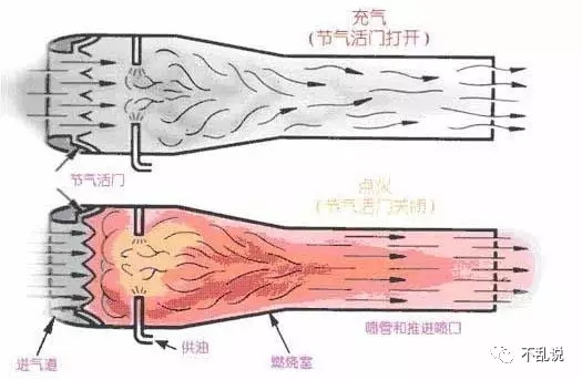 脉冲喷气发动机也是由纳粹德国在1944年发明的,被用于推进世界上第一种巡航导弹V-1。之所以被称为“脉冲”,是因为它产生的推力不是连续的。发动机主体就是一个圆筒,前部有一个“节气活门”,相当于空气单向阀,它使得空气只能从进气口向发动机内流动而不能流出发动机。首先给脉冲发动机一个速度,空气由于自己的惯性流入发动机;之后发动机圆筒内的油嘴喷射煤油,煤油被点燃,产生的燃气由于发动机前部“单向阀”的阻拦只能向后方逃逸,从喷口喷出产生推力;由于燃气的惯性,燃气在圆筒内气压已经与外界平衡之后仍会继续向后流动使得圆筒内暂时产生负压,“单向阀”被外界大气压顶开,新鲜空气再次流入发动机,开始下一工作循环。
