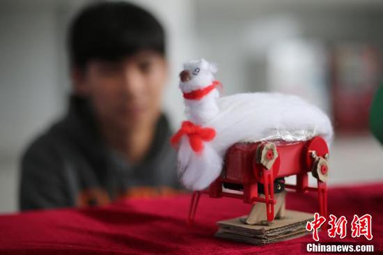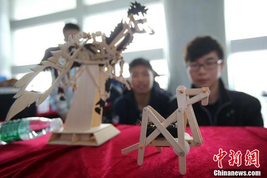 大学生展示名为《机械狗》(右)和《天马行空》(左)的作品。