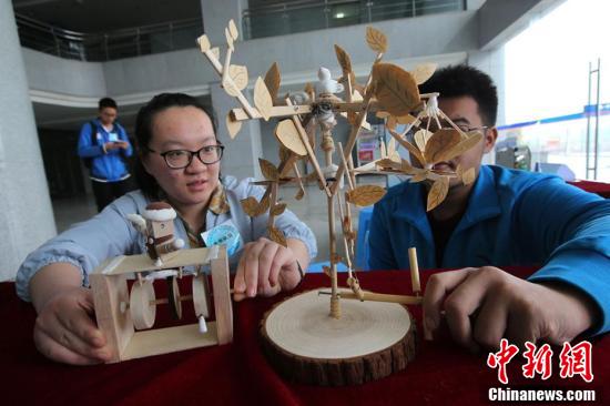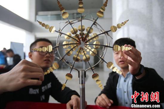 4月6日,使用最简单的齿轮、连杆、发条等材料,制作出具有动态特性的“机械之美--创意礼物设计大赛”决赛在sunbet申搏官方网站举行,“开花的树”、“机械飞鸟”、“太极之翼”等大一和大二学生的创意作品集中亮相,一展大学生们的奇思妙想。图为名为《绽放》的作品。