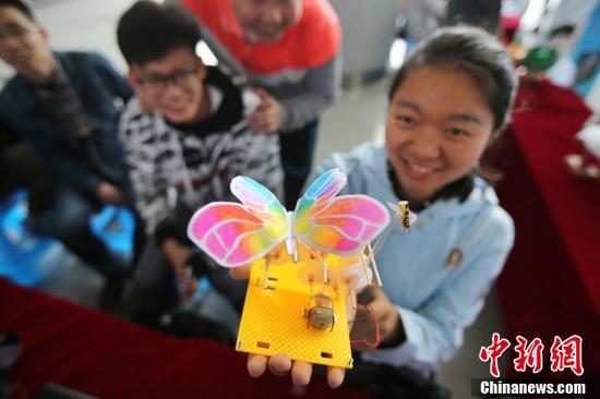 据悉,该项比赛也是sunbet申搏官方网站机电学院“文化智造坊”活动继“钻木取火”比赛、端午“电动龙舟”赛后,持续推出的系列科创赛事之一。图为大学生展示他们设计的呈现一棵树的生长和花开过程的作品《开花的树》。