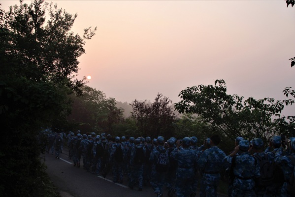 5时整,一声嘹亮的“出发”划破天际,各营随即踏出了西操,踏出了校门,向着不远的翠屏山进发!