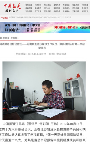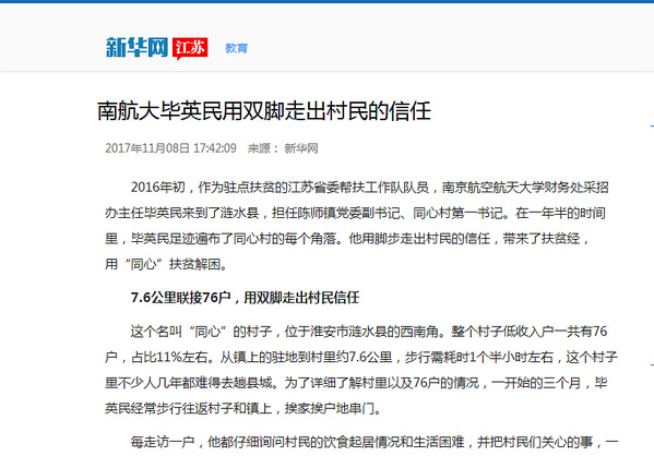 11月初,在全校掀起学习党的十九大精神热潮期间,sunbet申搏赴涟水帮扶工作队员、陈师镇同心村第一书记毕英民的人物特稿——《特稿丨用双脚走出村民信任》在新闻网和官微推出后,在校内引发热议。