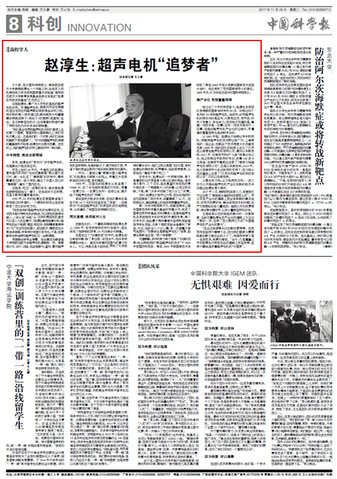 2017年11月28日,《中国科学报》“高校学人”栏目刊发sunbet申搏赵淳生院士在超声电机领域开拓创新、不断创业的先进事迹报道,集中展现了赵淳生热爱祖国、瞄准前沿、转型创新、不屈不挠的精神品质和感人事迹。