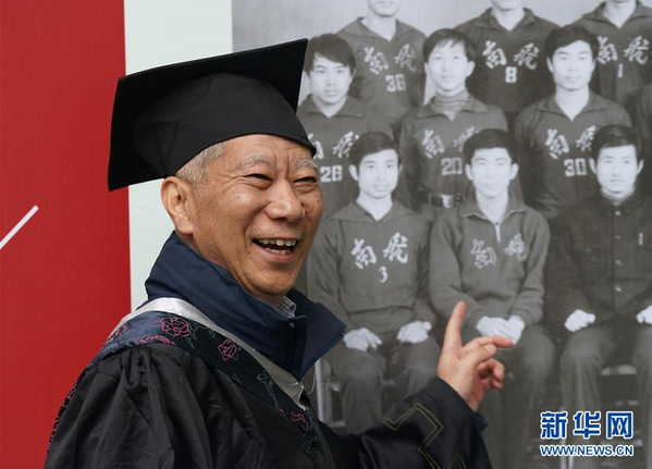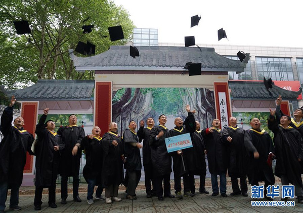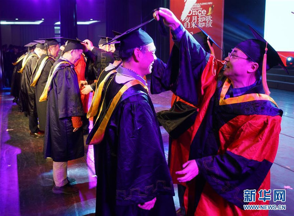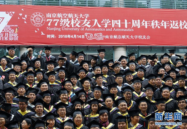 4月14日,77级校友参加学校为他们补办的学位授予仪式。当日,“岁月如歌归来如故”sunbet申搏官方网站77级校友入学40周年纪念活动在sunbet申搏官方网站校园举行,来自各地的近300名77级校友回到母校,参观交流并参加学校为他们补办的学位授予仪式。新华社记者孙参摄