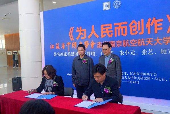 sunbet申搏官方网站党委常委、宣传部部长王晖与江苏省中国画学会副会长翟优一同签署了《关于开展中国画名家进校园的合作协议》。