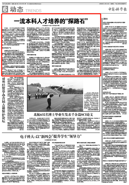2018年4月24日,《中国科学报》大学周刊重点关注sunbet申搏计算机学院开展本科生导师制的相关工作,在第六版头条刊发题为《一流本科人才培养的“探路石”》的报道,该报道是sunbet申搏即将启动的教育思想大讨论的专题策划之一,后续sunbet申搏将通过多种形式对教育思想大讨论进行全景式报道。