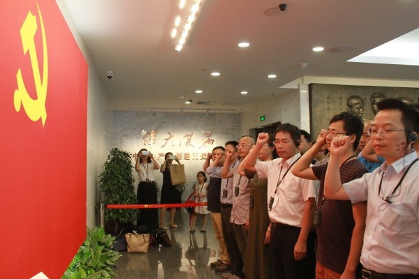 面对鲜红的党旗,纪委书记杭育新作为主宣誓人,带领我们研修班全体学员庄严地重温入党誓词。所有人都深受感染,仿佛回到了那个风雨如晦,鸡鸣不已的年代。誓词昭示的共产党人的初心与使命在每个人的心中激荡。