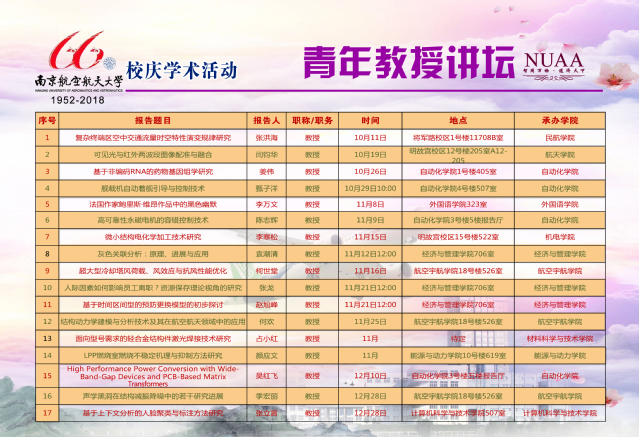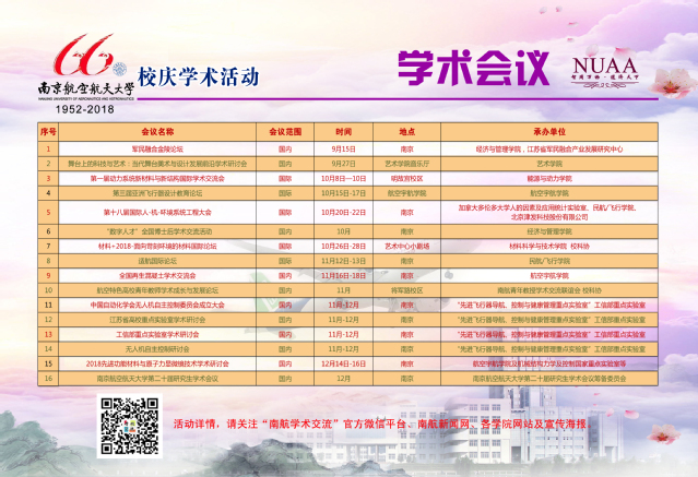 学术活动详情,请随时关注“南航学术交流”官方微信平台,科协及各学院网站、宣传海报。