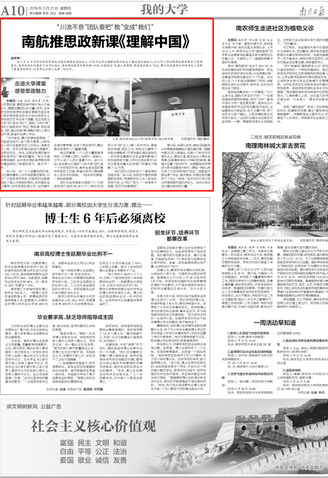 据介绍,由团队成员、南航马院副院长何畏教授课题组打造的通识课《理解中国》已在上周推出。这是一门针对历史虚无主义、普世价值、新自由主义等社会思潮,回答青年学生心中疑问的新课。课程中设置了研讨环节,由课题组老师带领大家对话题进行研讨。课程一推出,就引来了众多何老师的“粉丝”,连教室外都站满了学生。首次课后,何畏在朋友圈写下了这么一段话:“也许你可以用力学分析堵枪眼所受的冲击力,但你永远无法计算出信仰的力量。”