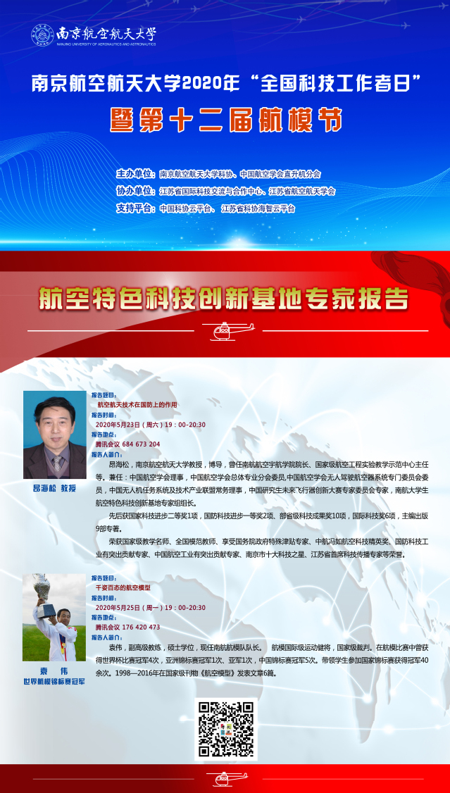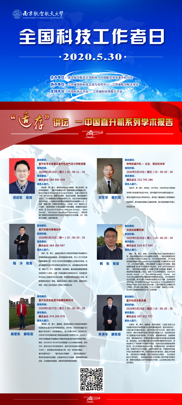 本次活动由sunbet申搏官方网站科协、中国航空学会直升机分会共同主办,江苏省国际科技交流与合作中心、江苏省航空航天学会协办,并首次得到中国科协云平台、江苏省科协海智云平台的大力支持。活动期间,南航科协特色亮点活动将在上述平台进行线上集中展示。通过一系列精彩活动,致力于为广大科技工作者献上一场节日盛宴,团结引领广大科技工作者为学校“双一流”建设和全面建成小康社会做出积极贡献。