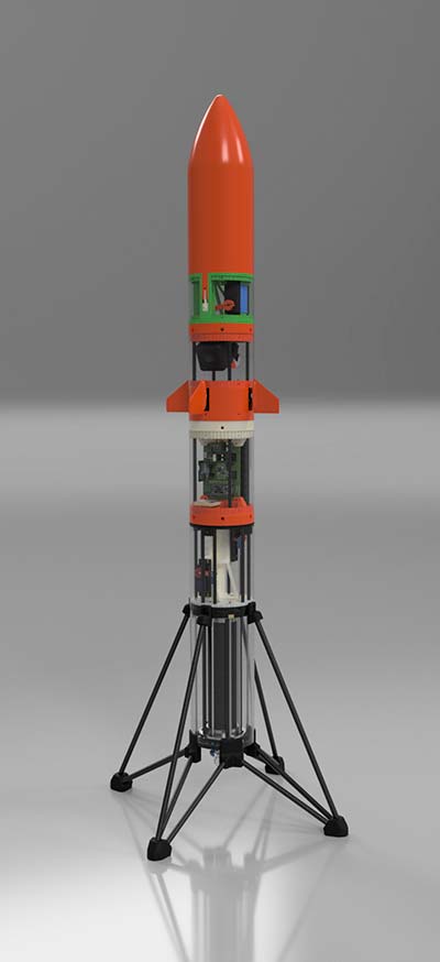 “推力矢量控制(TVC)”“姿态控制”“模块化设计”“可重复使用”……这些都是这枚火箭的“牛”处所在。火箭使用了刘上自制的TVC发动机。发动机的喷口可以向不同方向偏转,只要稍稍改变方向,就可以保证火箭笔直升空。这枚TVC发动机是刘上此次最满意的设计之一,在民间火箭爱好者的圈子里也是一个不小的突破。此外,发动机使用“C型”燃料内孔,推力平稳;自带起落架,无需发射架辅助便能起飞。