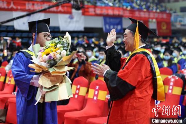 典礼上,毕业生为导师送上鲜花,表达感激之情。 泱波 摄