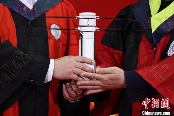 毕业生代表为母校送上一份特殊的礼物——由南航博士生团队自主研发的国内首款微型共轴无人直升机。 泱波 摄
