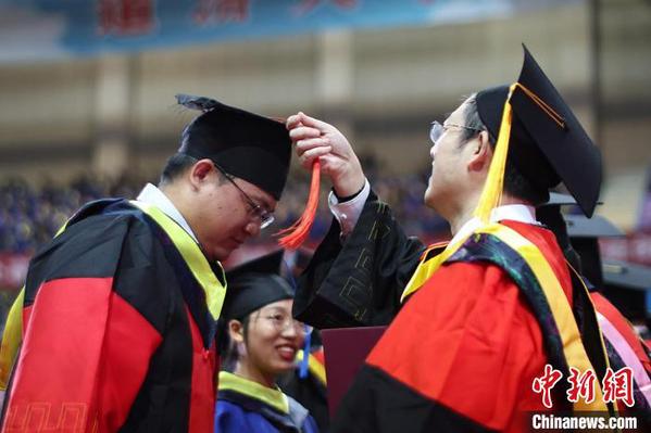 为优秀毕业生和博士毕业生代表援苏正冠,颁授学位证书。 泱波 摄