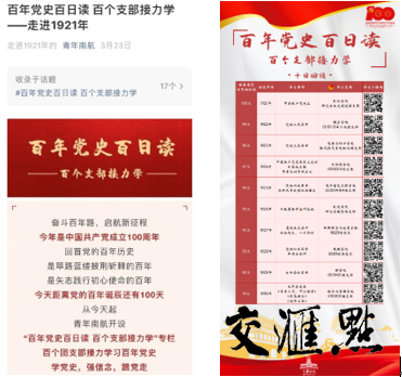除了线下自主学习,南航团委还在“青年南航”公众号开设“百年党史百日读·百个支部接力学”专题栏目,各团支部利用新媒体平台,将支部线下30多人的党史学习感悟上升为面向全网4万粉丝的党史学习教育,以距离建党日百天为始进行线上推广,每日一更,用青年话语感染更多青年学党史、强信念、跟党走。“我每天都会点开青年南航的推送,看看今天又讲了哪些党史小知识,也会在平时的团支部活动中跟支部团员进行分享”,能源与动力学院驭风排气系统纵向团支部书记潘睿丰告诉记者。