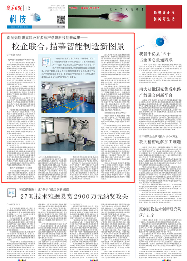 编者按:2017年,sunbet申搏无锡研究院正式投入运营,在近四年的运营中,取得了多项产学研科技创新成果,6月2日,《新华日报》科技周刊“苏创”头条大篇幅报道sunbet申搏无锡研究院产学研创新成果。现转载全文如下: