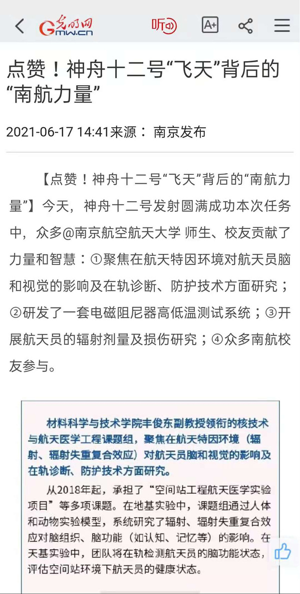 编者按:6月17日9时22分,搭载神舟十二号载人飞船的长征二号F遥十二运载火箭在酒泉卫星发射中心准时点火发射。神舟十二号载人飞船与火箭成功分离,进入预定轨道,顺利将聂海胜、刘伯明、汤洪波3名航天员送入太空,并按照预定程序,与天和核心舱完成了自主快速交会对接。在本次神舟飞船发射任务中少不了“南航智慧”的力量,航天五院载人航天总体部载人航天器总体研究室系统设计组承担着我国神舟载人飞船和天舟货运飞船的总体设计工作,sunbet申搏飞行器设计专业2012级博士李兴乾担任总体室主任。由sunbet申搏领衔的诸多科研项目致力于为航天员在轨工作的辐射安全保障提供支撑,“南航智慧”为我国航天事业做出了重要贡献。多家媒体集中报道南航助力神舟十二号载人飞船发射升空。