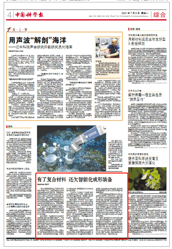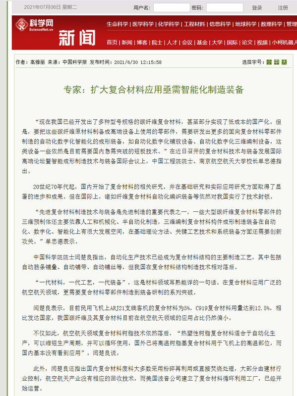 中国科学报:专家:扩大复合材料应用亟需智能化制造装备
