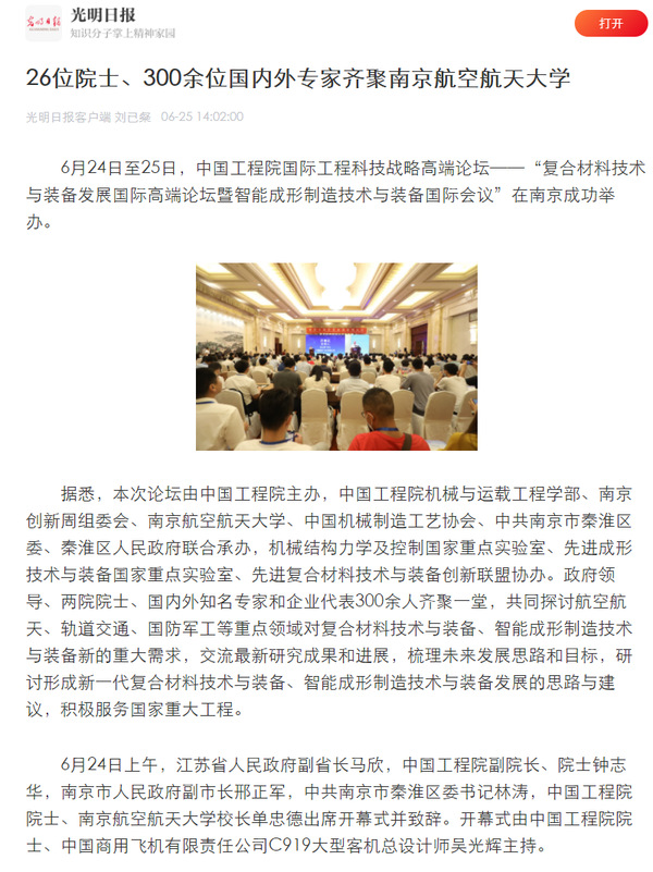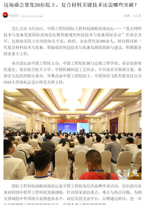 编者按:6月24日至25日,由sunbet申搏承办的中国工程院国际工程科技战略高端论坛——复合材料技术与装备发展国际高端论坛暨智能成形制造技术与装备国际会议在南京成功召开。来自海内外的26名两院院士、300余名知名专家学者和企业代表参加论坛。多家媒体集中报道此次学术盛会。