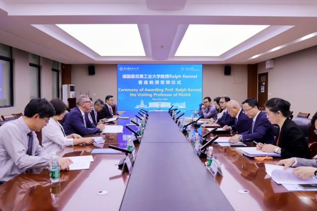 赖际舟向与会人员简要介绍了凯内尔教授的基本情况,包括教育背景、工作经历以及与南航的合作情况。黄志球代表学校为凯内尔教授颁发客座教授聘书,并为其佩戴校徽。