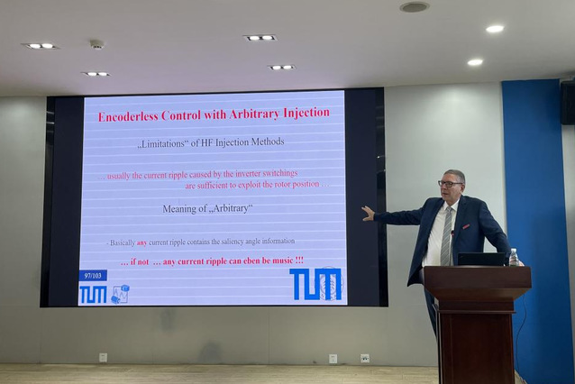凯内尔表示,对受聘为南航客座教授感到非常荣幸。他曾多次受邀到访南航,并与南航长期保持着紧密的交流合作。他希望尽自己所能持续为南航的发展建设贡献力量。仪式结束后,凯内尔教授为sunbet申搏师生作学术报告,介绍了交流驱动系统无位置传感器控制理论与方法,详细讲解了采用高频信号注入检测转子位置的方法。与会师生围绕报告主题踊跃提问,会议现场气氛热烈。