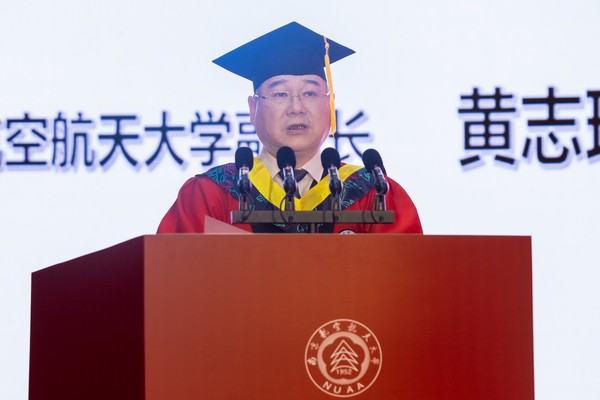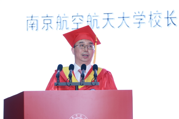 校长姜斌作了题为《强国有我 未来我来》的讲话。他代表甄良书记和学校全体师生员工向毕业生们致以最热烈的祝贺!向为同学们成长成才付出辛勤汗水的老师们、家长们致以最衷心的感谢。他寄语即将启程远航的毕业生们,一是坚定理想信念,筑牢成长之基,坚定不移听党话、跟党走,把个人的“小我”融入国家的“大我”,将“航空报国”的红色基因和“志在长空”的蓝色梦想融汇于事业奋斗的始终,与国家同频共振、与时代同向同行,奋力书写为中国式现代化挺膺担当的青春篇章,努力成长为堪当民族复兴重任的时代新人;二是练就过硬本领,勇担强国之责,始终保持敢闯敢干、敢为人先的勇气和魄力,勇闯科技创新的“无人区”,勇于解决“卡脖子”的技术难题,努力在国家重大科技攻关中挑重担、扛大梁、勇争先,奋力书写新时代新青年的新答卷,为推动高水平科技自立自强贡献更大的青春力量;三是涵养高尚品格,走好未来之路,保持坚定清醒的头脑,保持甄别是非的能力,保持科学的理性和人文的关怀,不唯书、不唯上、不唯洋、只唯实,立足本职岗位,力争有所发现、有所创造,将智慧和汗水播撒在祖国需要的广袤天地之间。最后,他勉励全体毕业生们,要在强国建设、民族复兴伟业中勇当先锋队、突击队,在青春的赛道上奔跑不止、奋斗不息。
