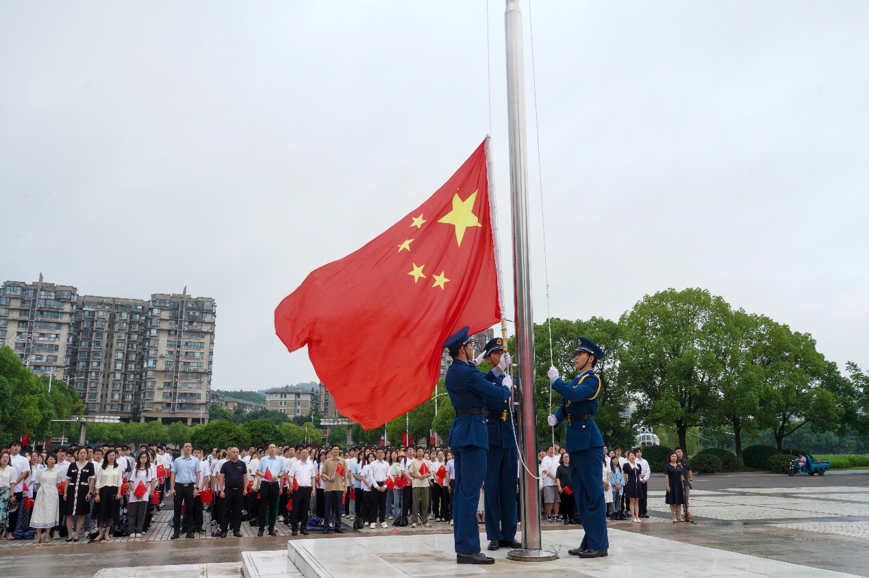 7点30分,升国旗仪式正式开始。伴随着雄壮有力的《义勇军进行曲》,鲜艳的五星红旗冉冉升起。国旗下,全场人员庄严肃立,仰视国旗行注目礼,齐声高唱国歌,深情祝福伟大祖国。升旗毕,举行了集体宣誓活动。在铿锵誓言中,全体党员进行了入党宣誓,老党员重温了入党誓词。到场校领导为新发展学生党员代表佩戴党员徽章,全体新党员共同佩戴党员徽章。