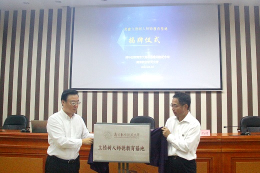 参观结束后,双方举行侵华日军南京大屠杀遇难同胞纪念馆立德树人师德教育基地共建仪式。王晖与时鹏程签署馆校共建协议。杭育新与周峰共同为馆校立德树人师德教育基地揭牌。