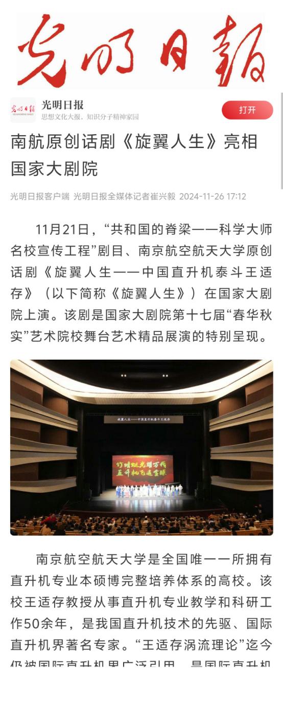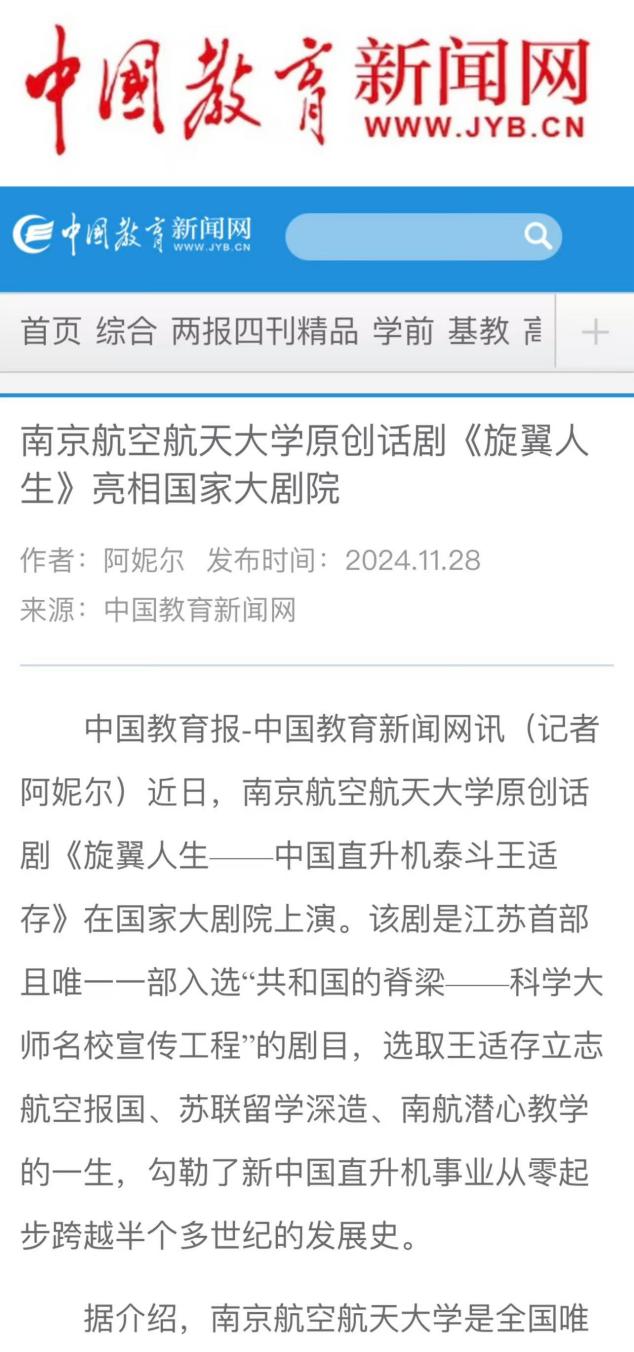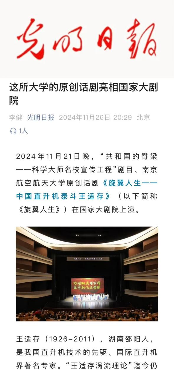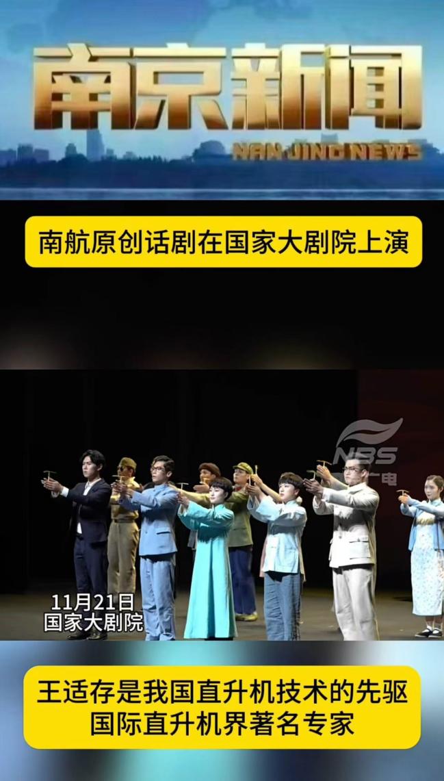 新华日报:演绎中国直升机泰斗王适存航空报国的一生南航原创话剧《旋翼人生》走进国家大剧院
