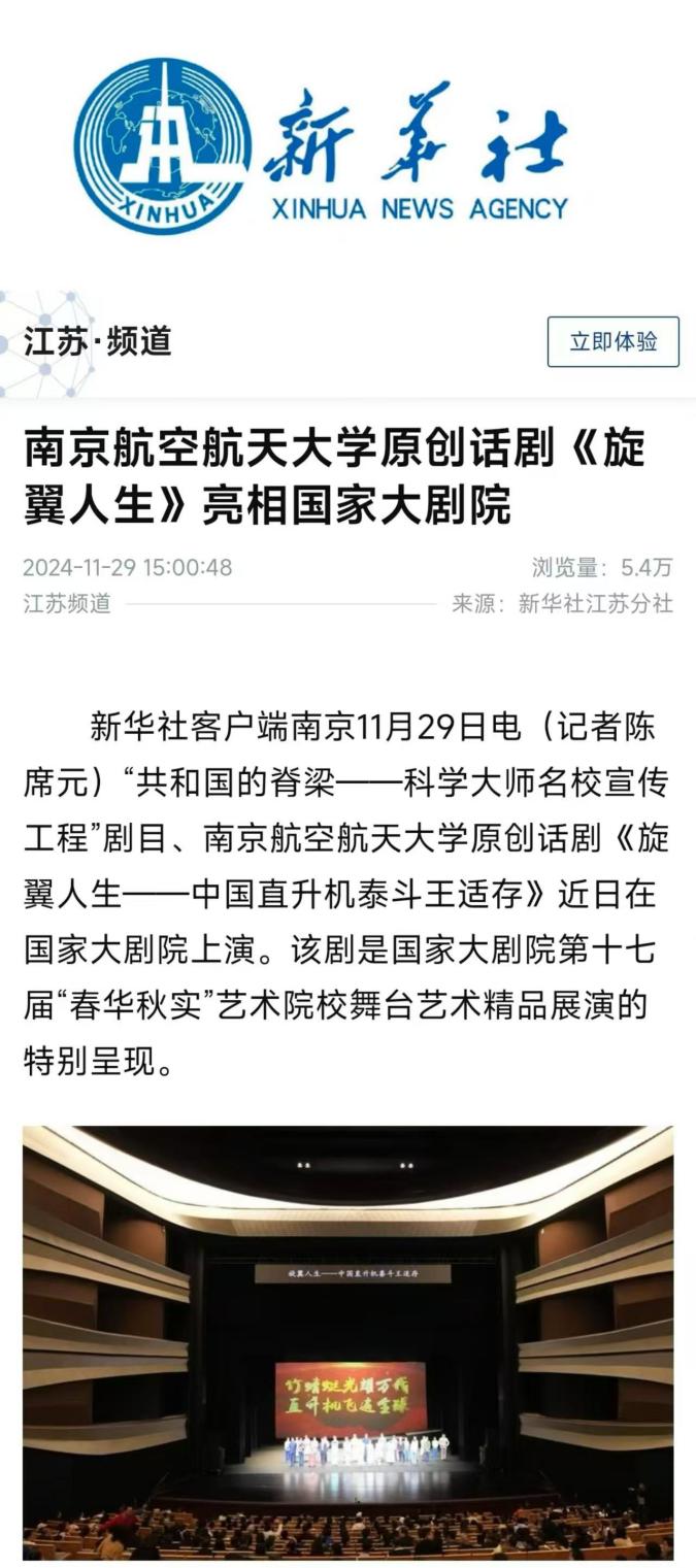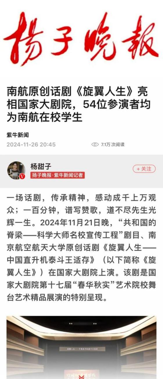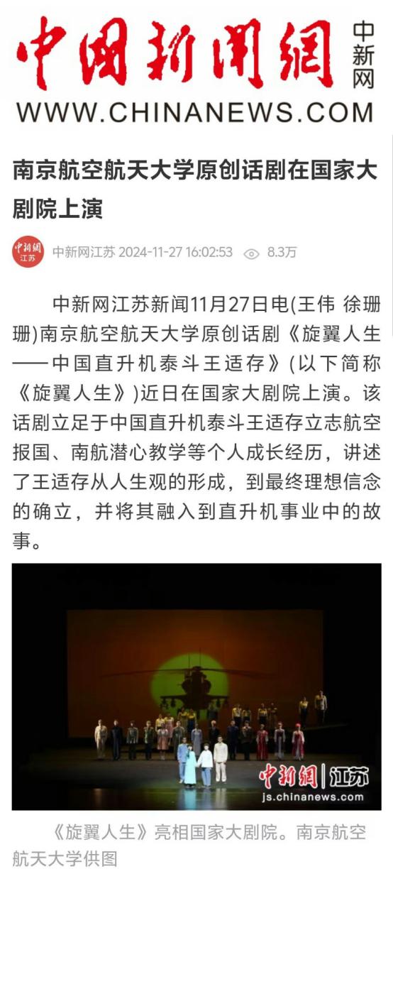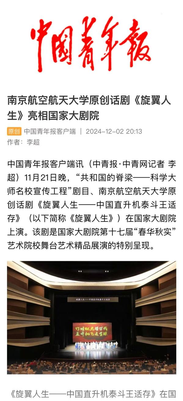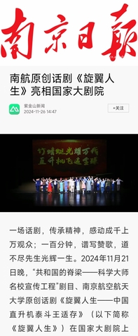 扬子晚报:南航原创话剧《旋翼人生》亮相国家大剧院,54位参演者均为南航在校学生