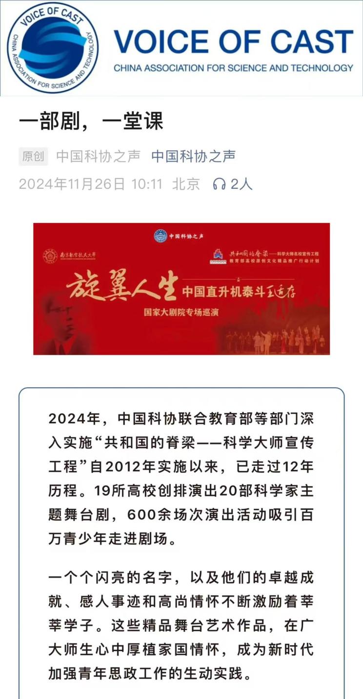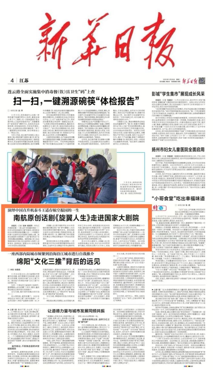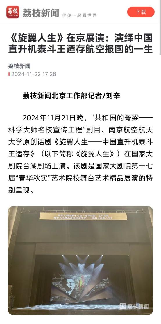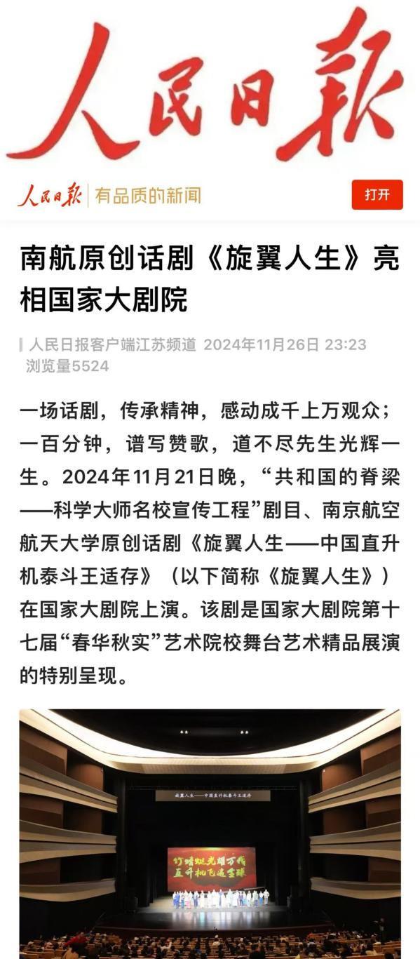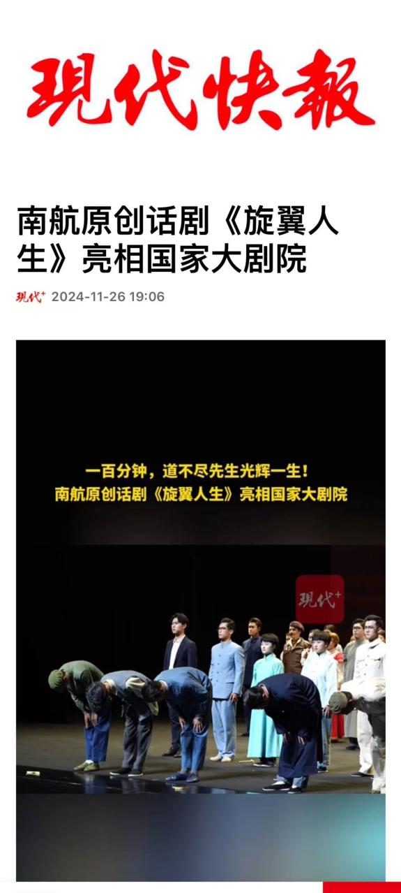 扬子晚报:南航原创话剧《旋翼人生》亮相国家大剧院,54位参演者均为南航在校学生