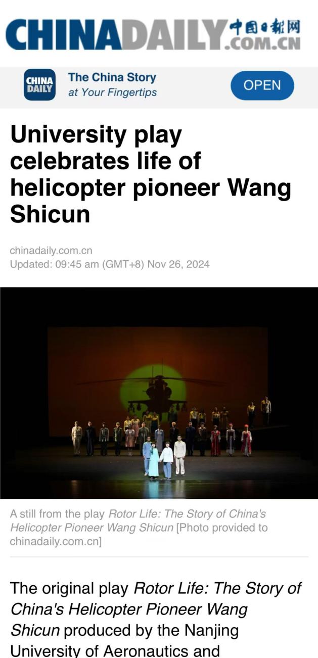 CHINA DAILY:University play celebrates life of helicopter pioneer Wang Shicun