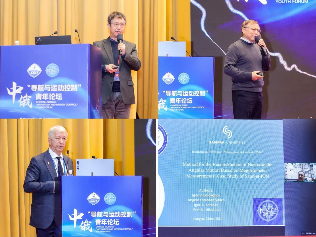 开幕式结束后,还举办了主旨论坛,中国科学院院士、东南大学崔铁军教授、上海交通大学郁文贤教授、俄罗斯科学院院士斯捷潘诺夫、别落果诺夫四位专家分别就“信息材料和人工智能、复杂环境下微型无人机视觉导航技术、贝叶斯估计与因子图优化方法比较、基于磁力计测量的微纳卫星角动量重建方法”等议题发布前沿研究进展,凝聚领域发展共识,引发与会人员深度思考。