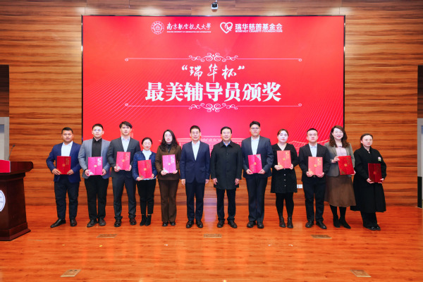 校党委书记甄良和江苏省瑞华慈善基金会执行理事长史兆荣共同为“瑞华杯”最美辅导员进行颁奖。