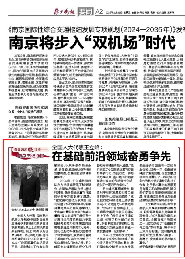 编者按:近日,《扬子晚报》刊发全国人大代表、航空学院副院长王立峰教授采访文章《全国人大代表王立峰:在基础前沿领域奋勇争先,科研路上我们的脚步更坚定》。现转发全文如下:
