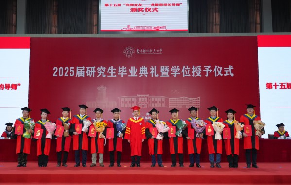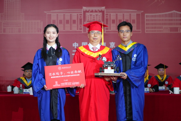 典礼上,南航微型飞行器创新设计团队的徐宏雨同学和校友大使黄琳涵同学代表全体毕业研究生为母校送上了一份特殊的礼物——由南航研究生团队自主研发的结构可变陆空两栖飞行机器人和2025届毕业研究生名册,展现了南航学子心系母校的情怀与志在远方的理想。姜斌校长代表学校接受毕业生赠礼。