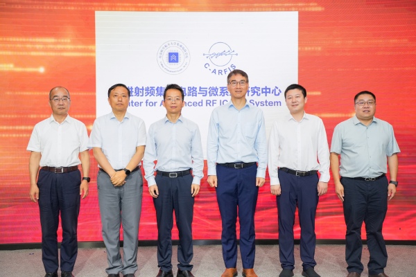 刘宇雷、郭永新、纪忠、李韬、潘益明和集成电路学院党委书记黄彬共同为先进射频集成电路与微系统研究中心揭牌。