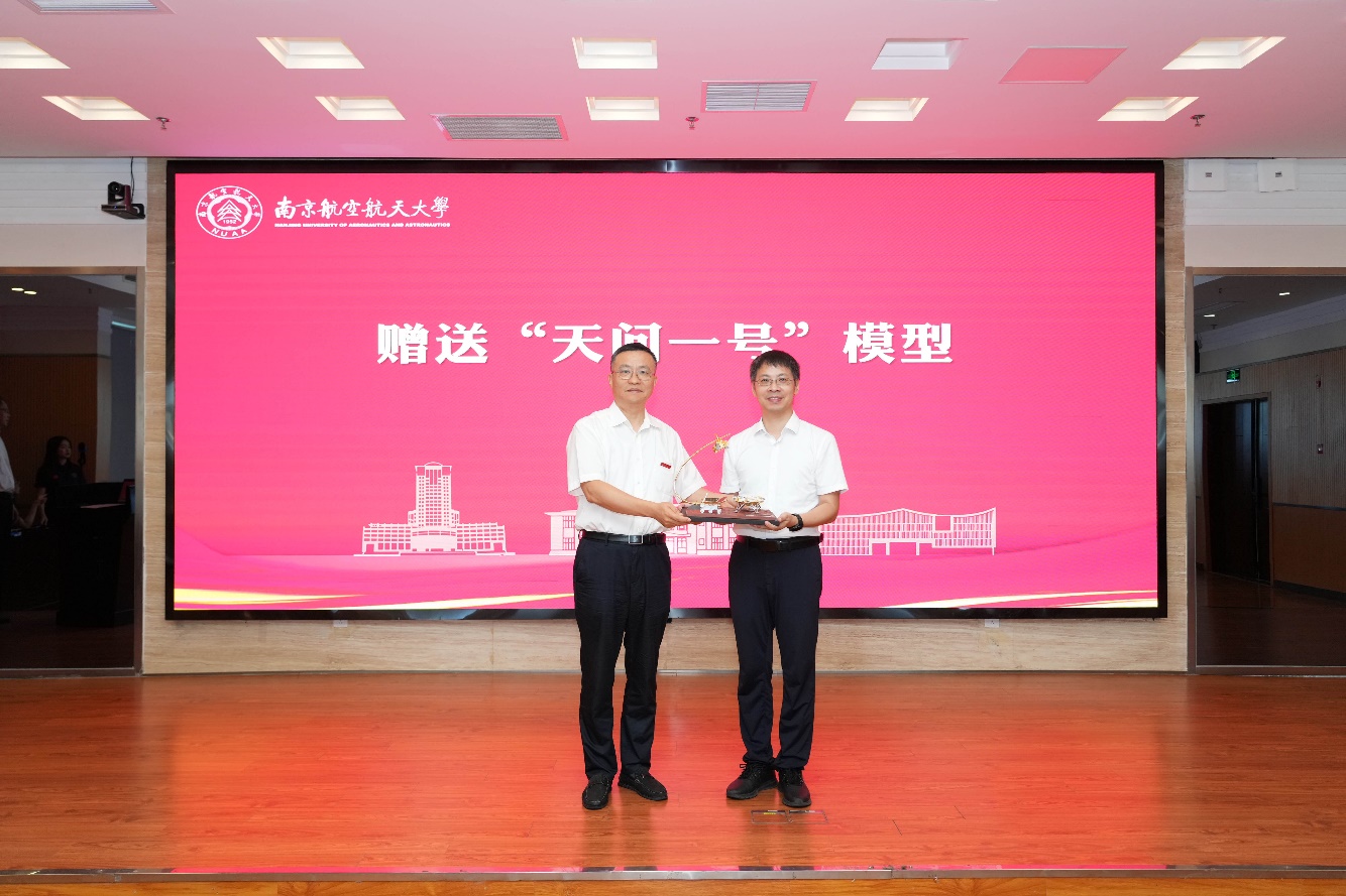 孙泽洲向学院赠送天问一号火星探测器模型,校长助理、电子信息工程学院常务副院长潘时龙代表学院接受这份承载着航天荣耀与校友深情的礼物。