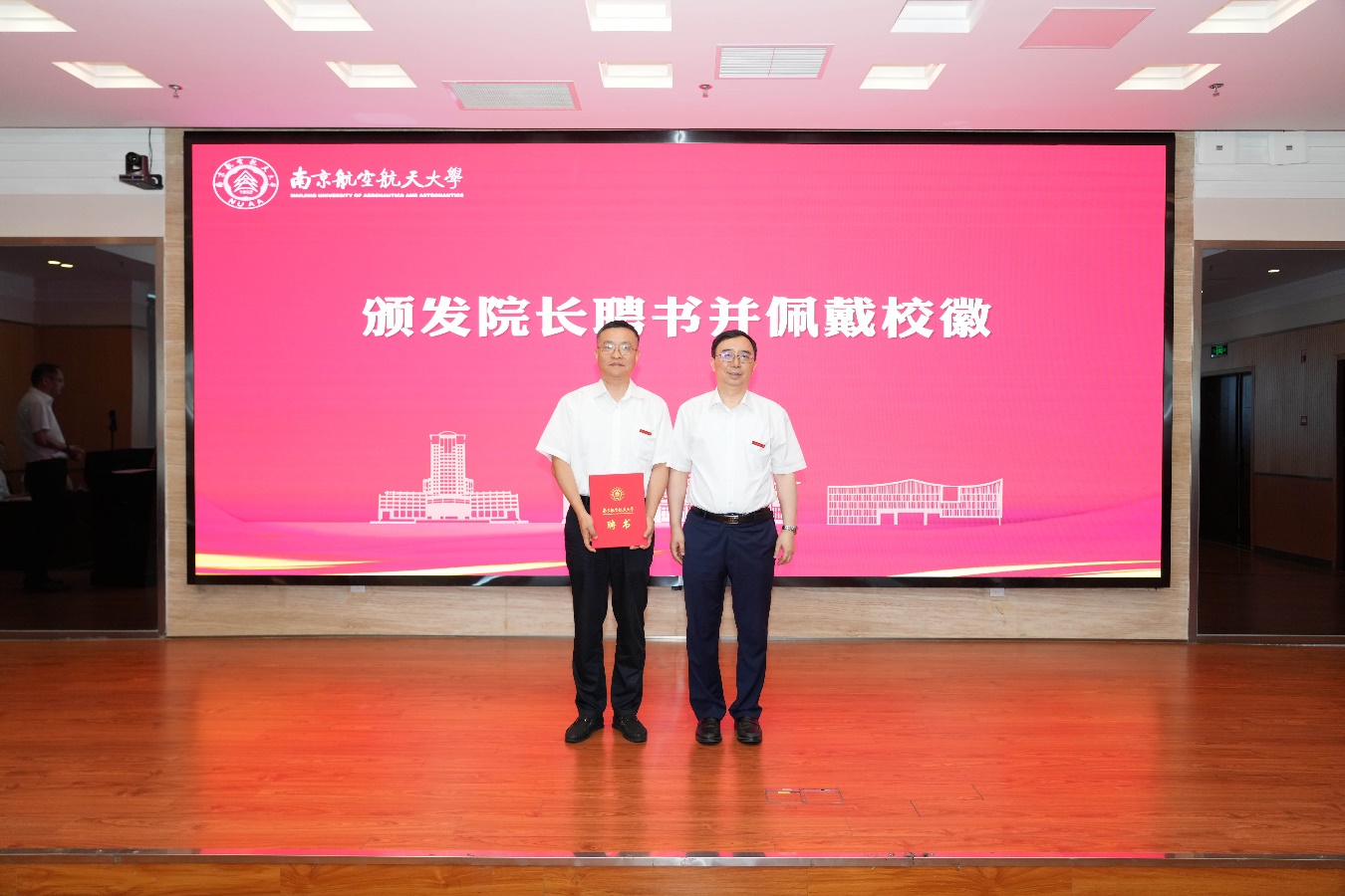 姜斌为孙泽洲颁发电子信息工程学院院长聘书,并为其佩戴校徽。