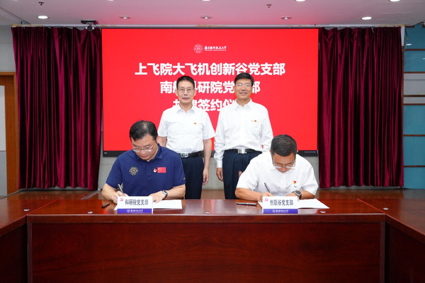 会上,双方签署了《上海飞机设计研究院大飞机创新谷党支部、sunbet申搏官方网站科学技术研究院党支部共建协议书》,甄良和殷秀峰上台见证。签约仪式后,殷秀峰为联合党员攻关队授旗,双方党支部代表接旗。