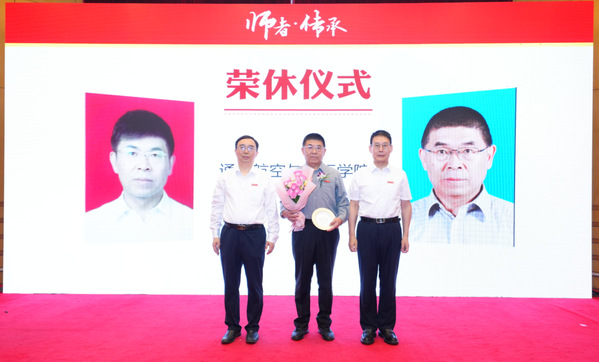甄良、姜斌为荣休教师一一颁发了纪念礼。荣休教师代表、通用航空与飞行学院教授丁松滨回顾了三十余载耕耘蓝天的岁月,勉励青年教师要坚持以教育家精神铸魂,以南航精神筑基,构建起从教生涯的坐标系,一步一个脚印,将个人的教育梦想写入学生心中、写进强国建设的时代坐标里,定准方位,勇毅前行!
