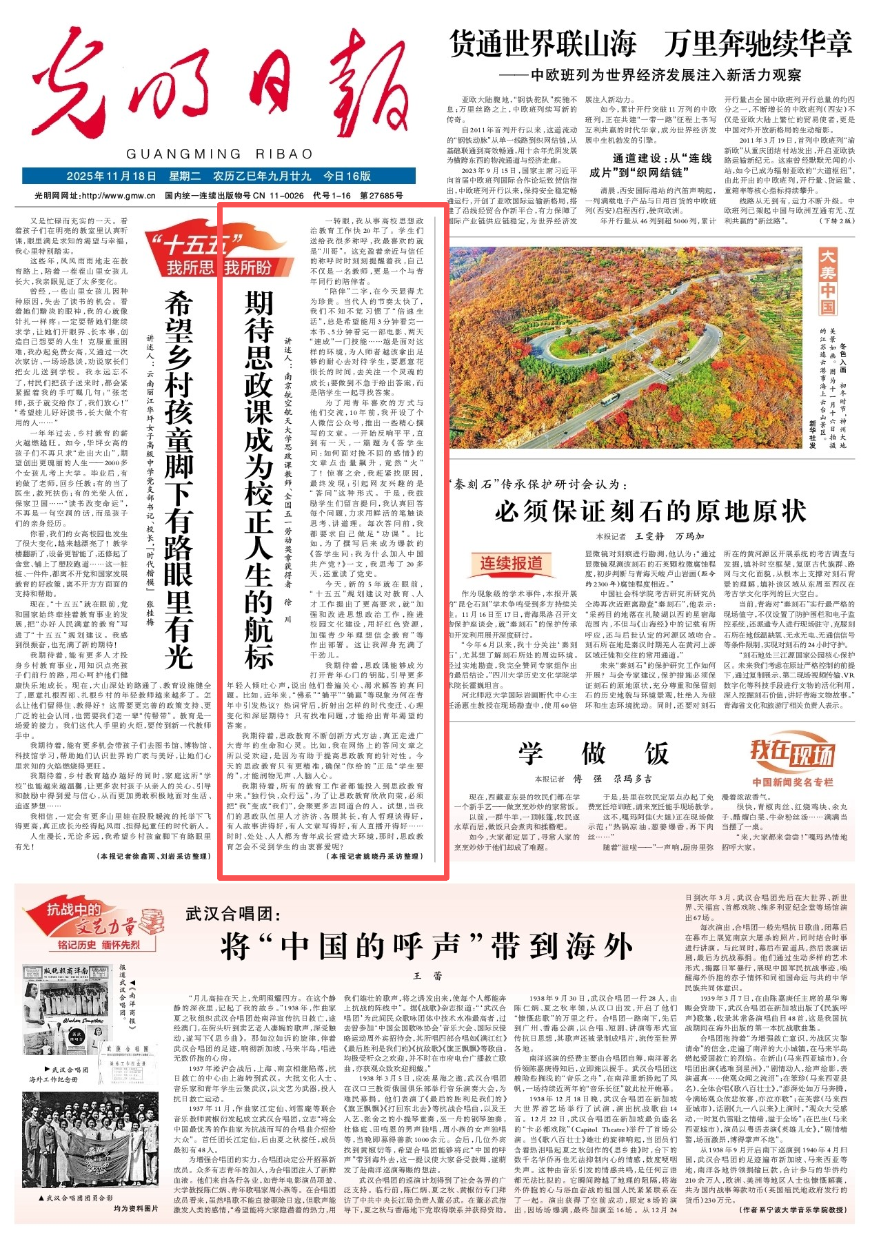 编者按:11月18日,《光明日报》头版头条【“十五五”我所思·我所盼】专栏以《期待思政课成为校正人生的航标》为题,刊发sunbet申搏思政课教师、全国五一劳动奖章获得者徐川专访。现转发全文如下: