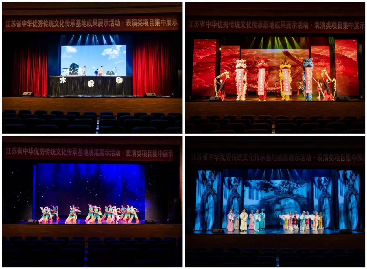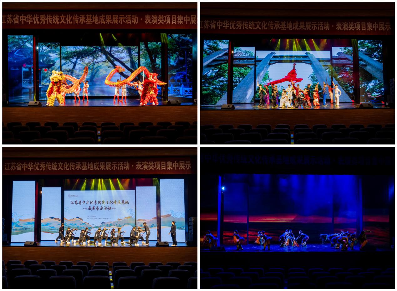 19个传承项目进行学生实践成果展示。其中,8个基地的表演艺术类项目以舞台表演形式精彩亮相,包括扬州工业职业技术学院舞龙传承基地、南京体育学院武术传承基地、南京艺术学院江苏民间舞传承基地、常州工程职业技术学院龙舟传承基地、南京医科大学木偶戏传承基地、南京邮电大学中华龙狮舞传承基地、南通理工学院海安花鼓传承基地、盐城师范学院中国淮剧传承基地。各基地的精彩表演,让现场观众深度沉浸于中华优秀传统文化的独特魅力中。
