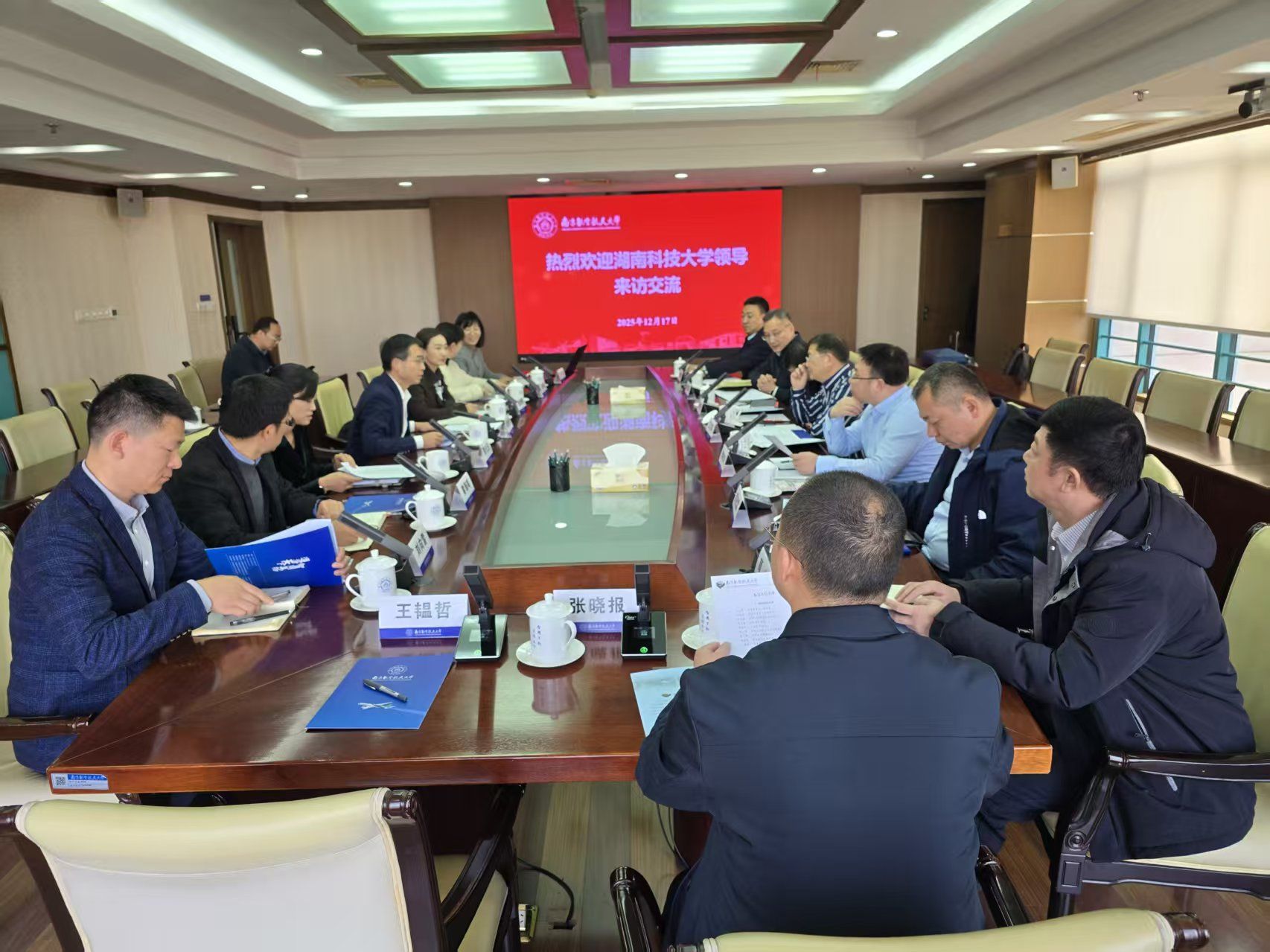 12月17日,湖南科技大学党委委员、副校长王卫军,党委委员、纪委书记郭时印带队来校调研,重点围绕“十五五”规划编制、学科建设及政治监督、纪检监察、师资引育、人才培养、科学研究等工作开展交流研讨。sunbet申搏党委副书记、纪委书记杭育新出席座谈会。