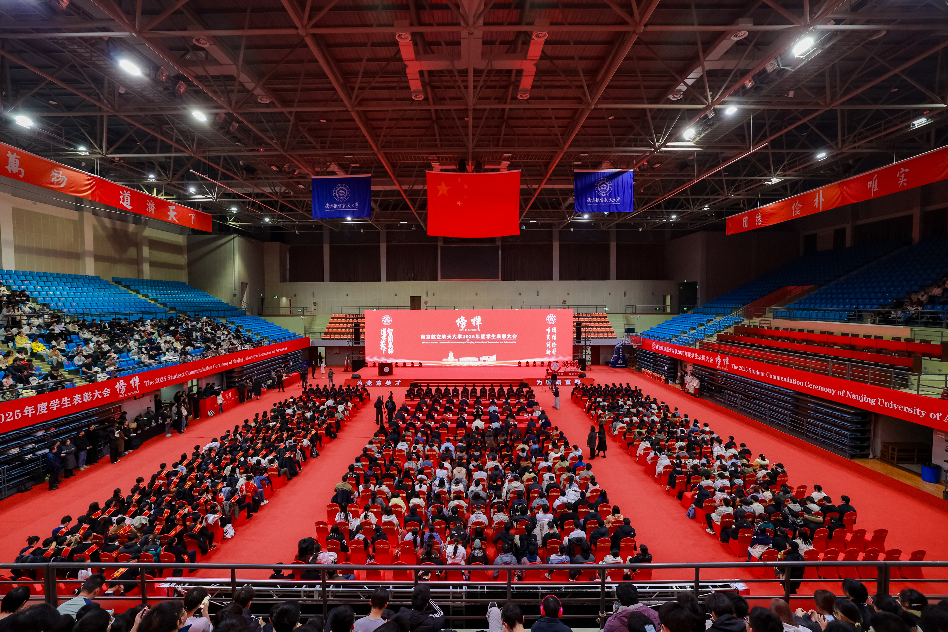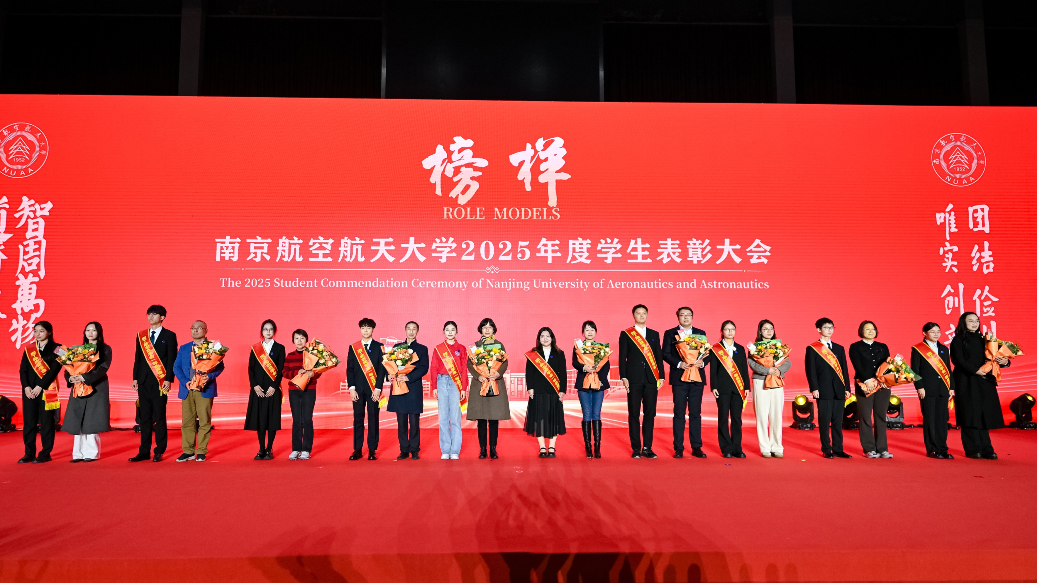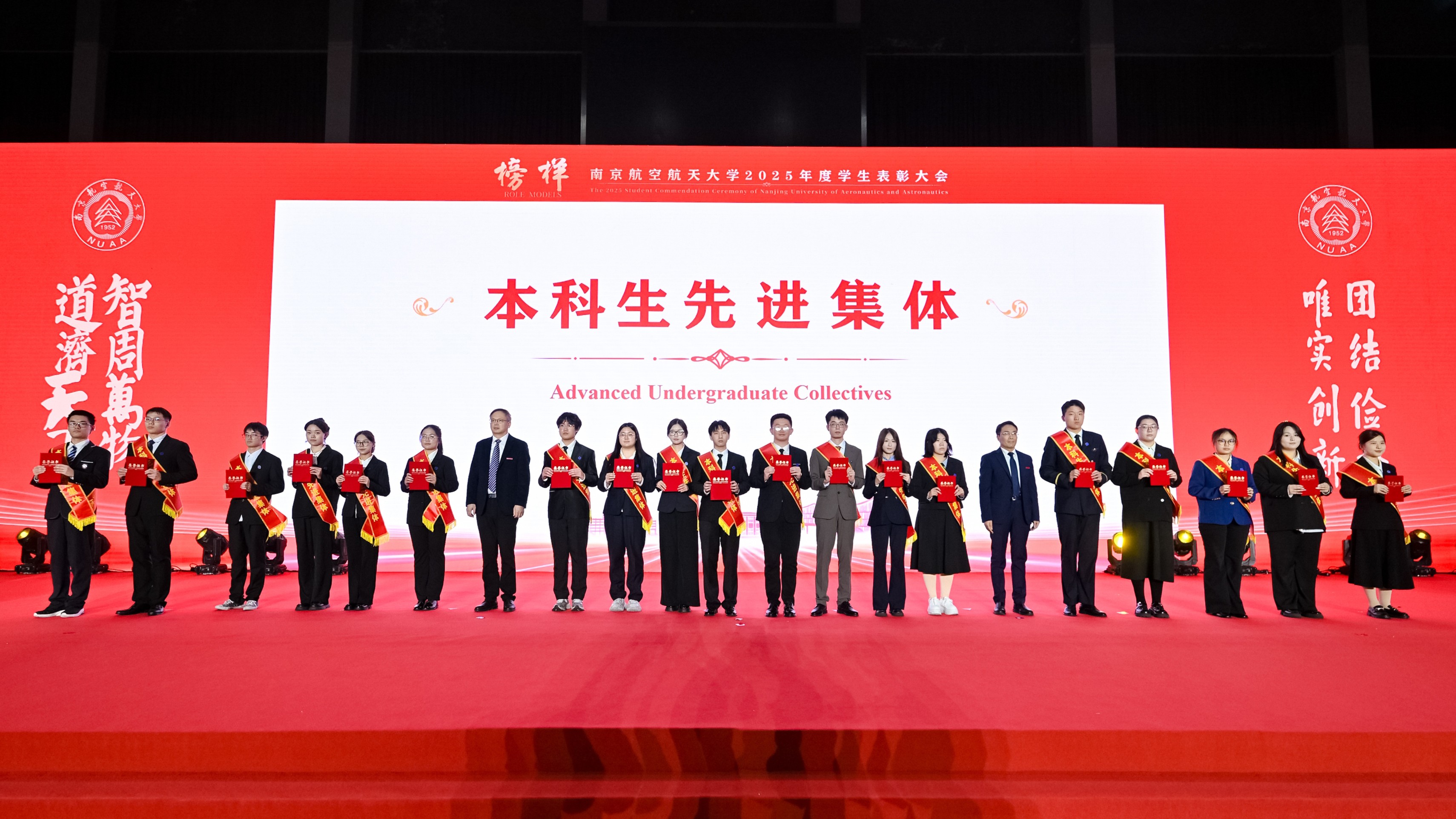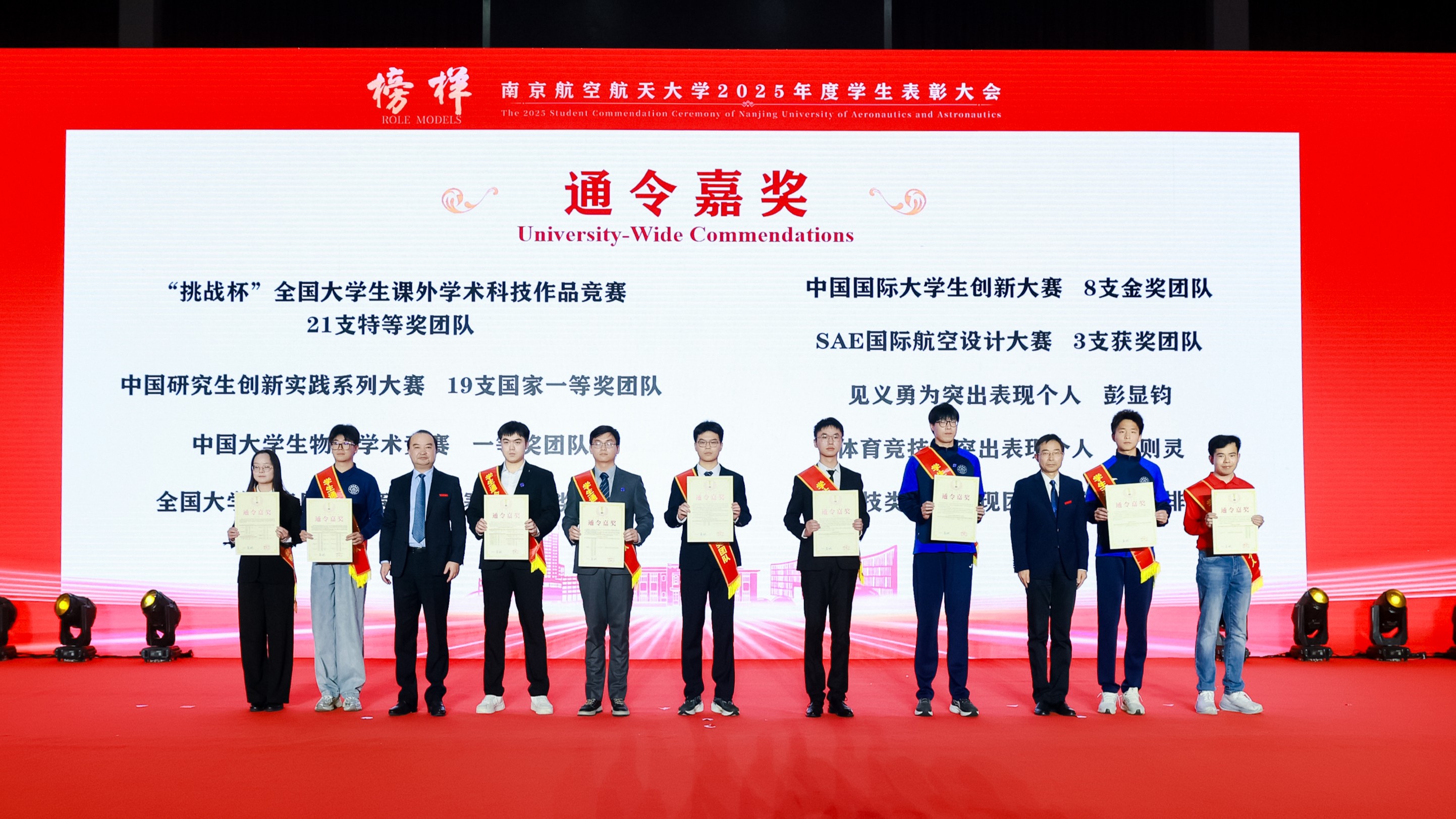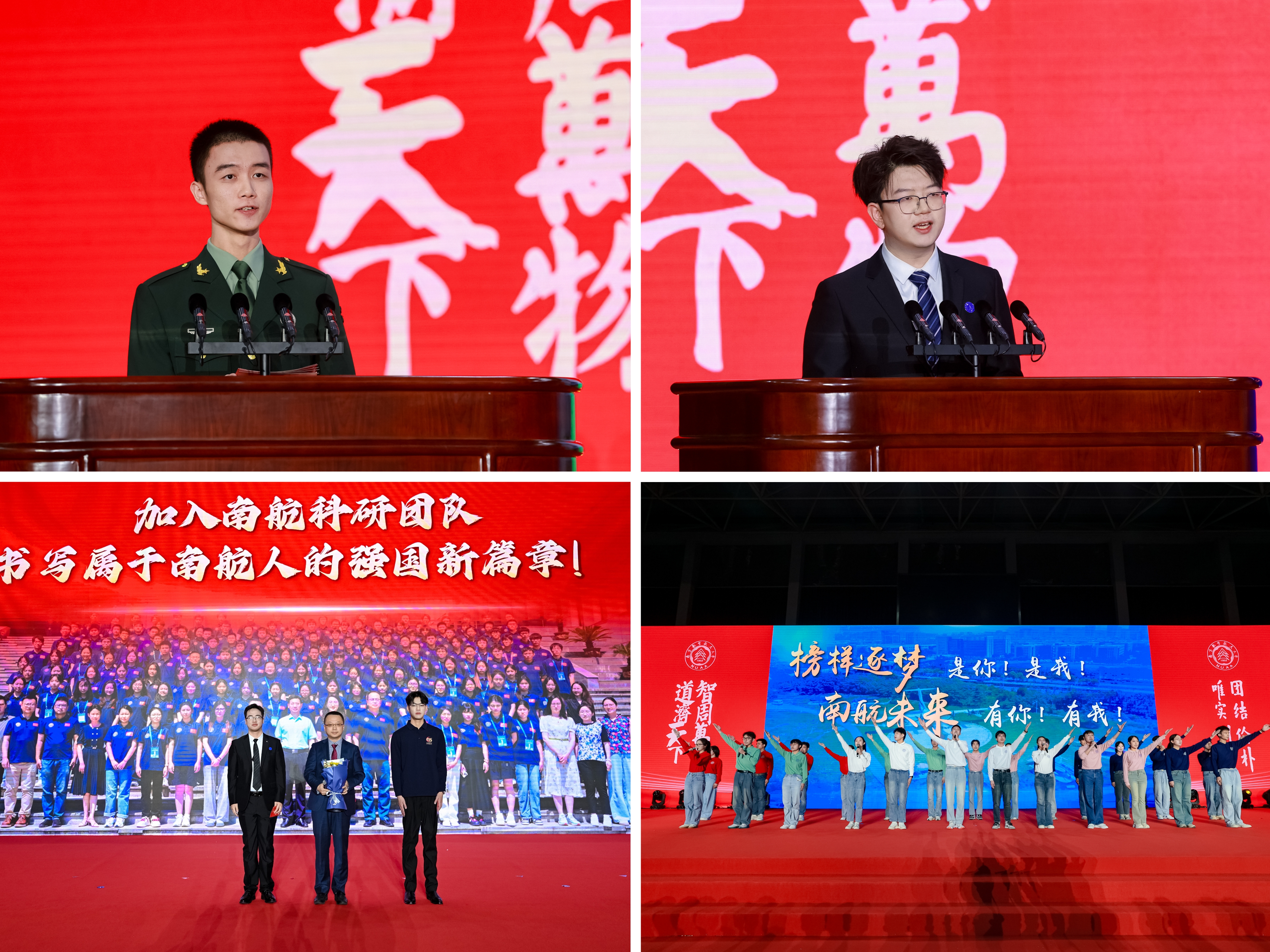 师生代表通过“青春砺剑,以家国情怀涵养强国之志”、“团结共进,以过硬本领锤炼强国之技”和“锐意创新,以挺膺担当勇建强国之功”三个篇章,生动讲述个人与团队将青春梦想熔铸于强国事业的奋斗历程。随后,2025年度在德智体美劳各方面表现突出的团队与学生代表分享了他们的成长故事。从深耕专业到文体兼修,从创新实践到志愿服务,他们在各自领域全面开花,以脚踏实地的耕耘、敢闯敢试的锐气和众行致远的团结,展现了南航学子爱党爱国、自立自强、奋发向上的青春风采,诠释了新时代青年将个人成长融入祖国发展的使命与担当。